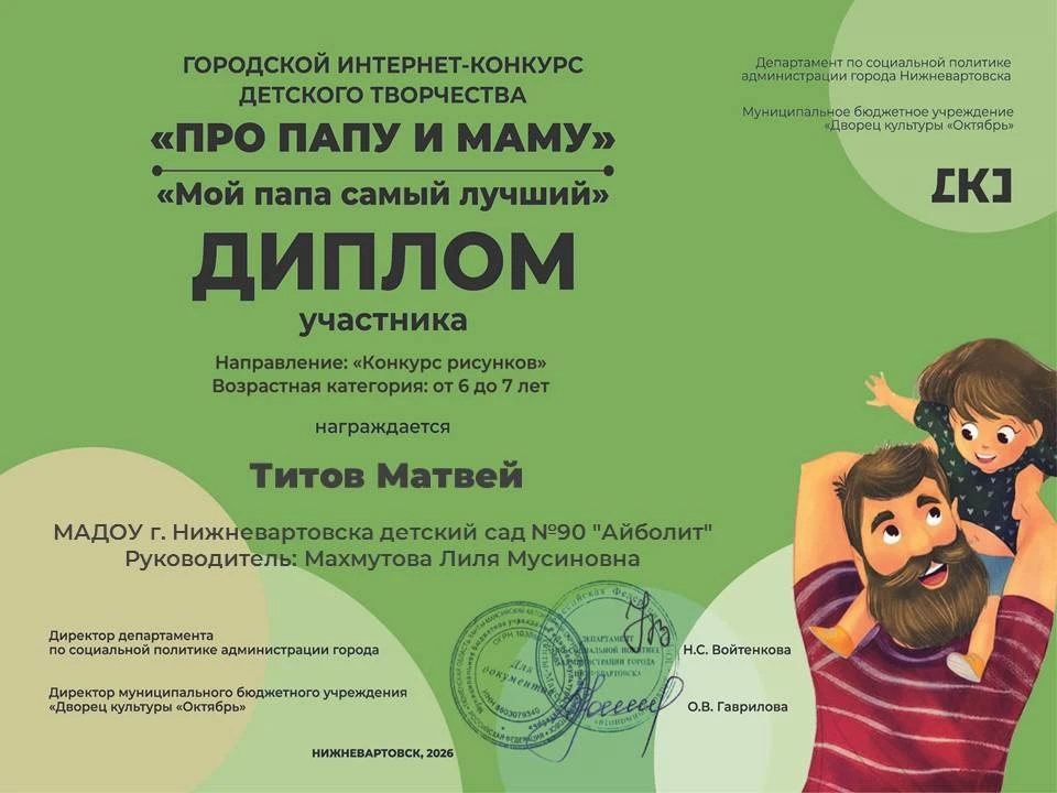Городской интернет-конкурс детского творчества "ПРО ПАПУ И МАМУ" Диплом участника